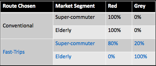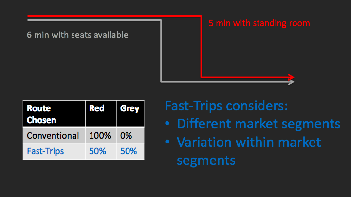 Furthermore, rather than grouping every individual into a category (“market segment”) that chooses based on the average desire of the people in that category (i.e. all the speed-demons will pick the 38L despite there not being any seats), Fast-Trips has the ability to understand that “speedy” is relative - and that some speed-demons are more speed-driven than others (i.e. some might be okay with a trip that is a minute slower, but where you can get a seat to read your book.