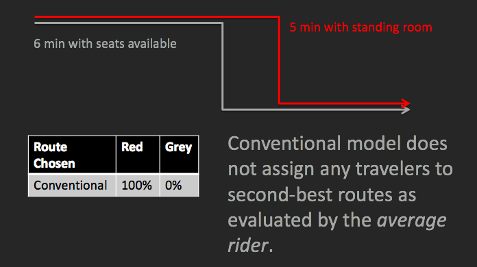 Furthermore, because conventional transit models do not have a concept of an individual rider, you cannot easily summarize a rider’s experience across the entire system (critical for capturing reliability from the rider’s perspective) or calculate “select links.”