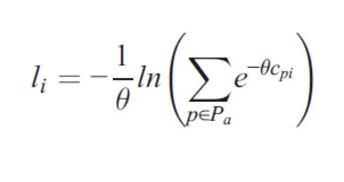 - θ is the dispersion parameter used for modeling stochasticity. This parameter is between 0 and 1. Higher values for the parameter mean that higher cost links within a hyperlink are devalued compared to the lowest cost links in the hyperlink. That is, if the lowest cost for a hyperlink is c, when a new link gets added to the hyperlink with a cost higher than c, when θ is closer to 1, the more the new link has a low probability compared to the lowest cost link. The higher θ emphasizes the lowest cost link more.